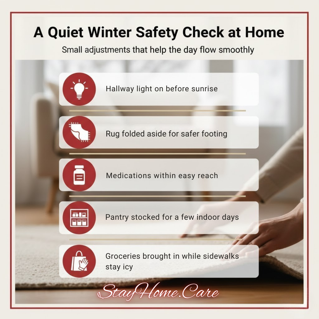 At StayHome.Care, we notice how thoughtful preparation and quiet support can help home continue to feel steady through the colder months. Sometimes safety is not about changing the home. It is about making small adjustments that let life carry on comfortably.